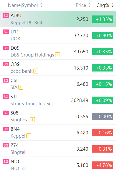 Singapore stocks opened flat on Friday. Keppel DC Reit rose 1.35%; UOB Bank rose 0.8%; NIO fell 4.78%.