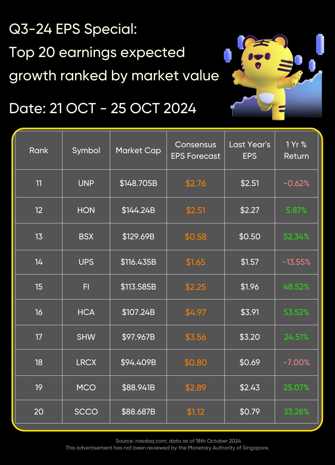 $RTX Corp(RTX)$ , $S&P Global(SPGI)$ , $Union Pacific(UNP)$ , $Honeywell(HON)$ , $Boston Scientific(BSX)$, $United Parcel Service Inc(UPS)$ , $FISERV INC(FI)$ , $Hca Healthcare Inc(HCA)$ , $Sherwin-Williams(SHW)$ , $Lam Research(LRCX)$ , $Moody's(MCO)$ and $Southern Copper Corp(SCCO)$ are releasing their earnings, and consensus earnings per share forecasts are higher than data from the same period last year.,Are you interested in betting on these stocks?