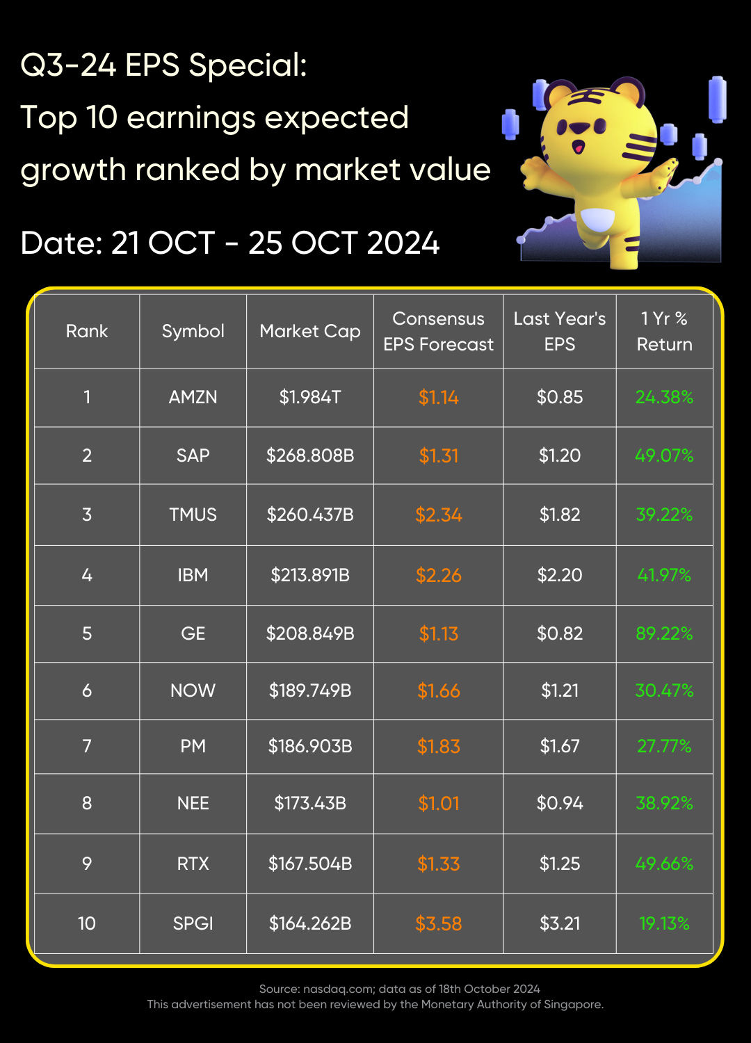 On October 21 to October 25, $Amazon.com(AMZN)$ , $SAP SE(SAP)$ , $T-Mobile US(TMUS)$ , $IBM(IBM)$ , $GE Aerospace(GE)$ , $ServiceNow(NOW)$ , $Philip Morris(PM)$ , $NextEra(NEE)$