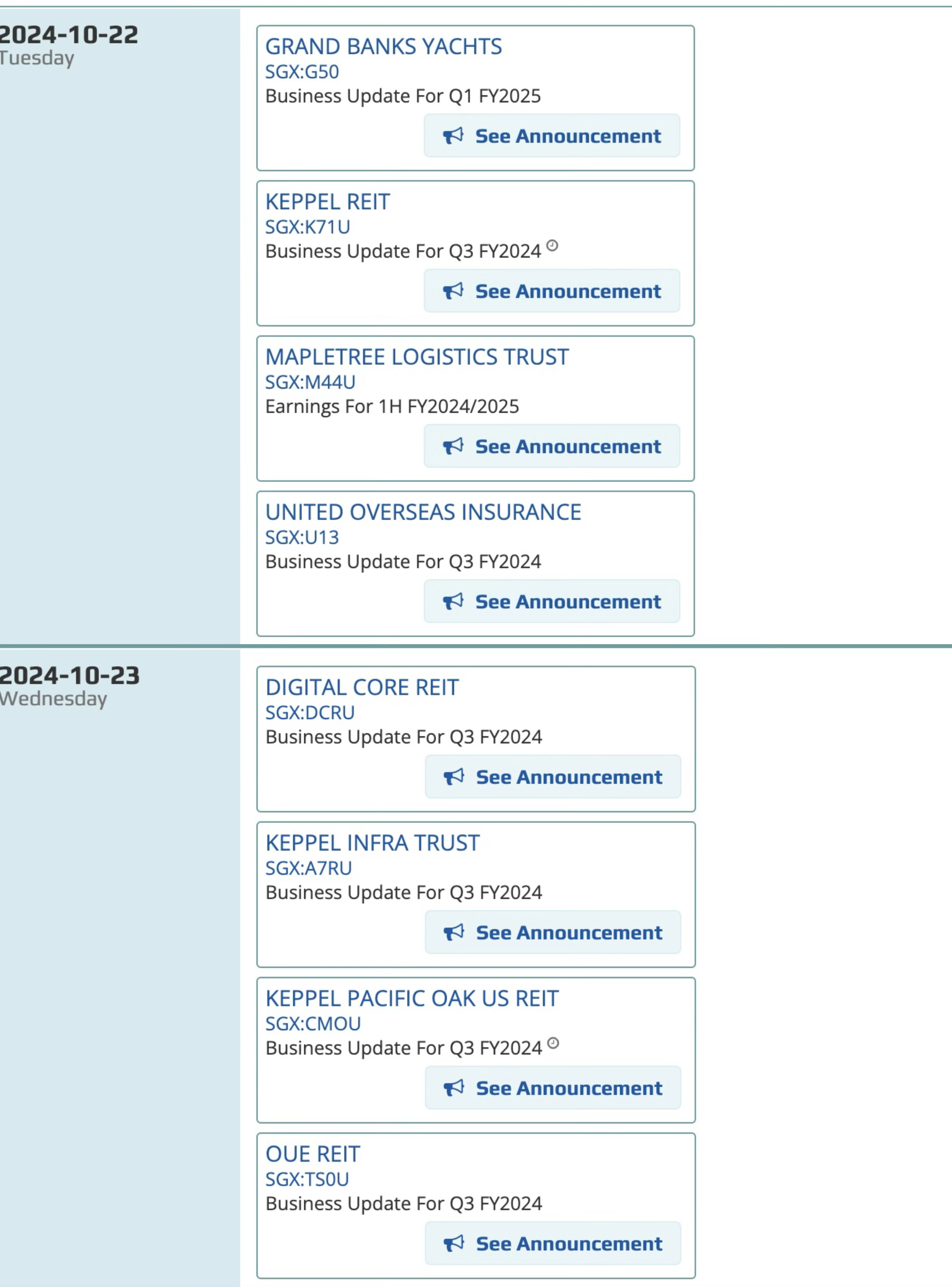 The earnings updates continue on October 24th, with Capitaland India Trust, Keppel Corporation, and Suntec REIT set to report their figures.