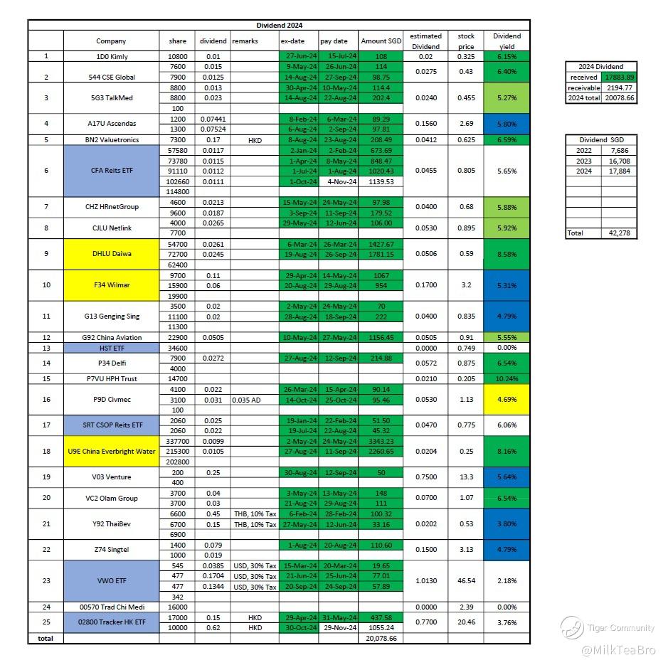 All the dividends from 2024 were announced, I got 20k as my expectations, average dividends yield is about 5%. My portfolio passive income is a certainty but portfolio assets value is unknown in the short, medium term. Bear market accumulated shares and dividends, bull market lock capital profits. Value investment is better than Derivatives. Boring is the disadvantages of value investment.