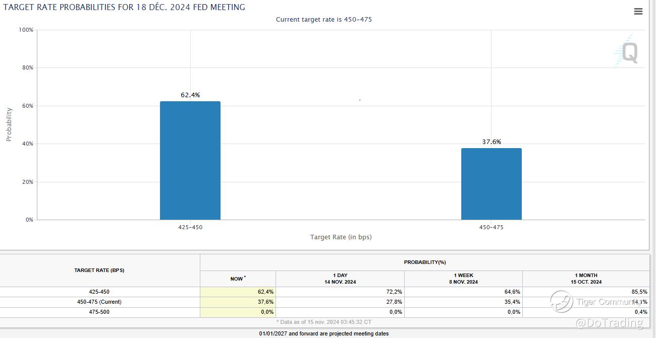 Markets were already trending downward when Federal Reserve Chairman Jerome Powell addressed the Dallas Regional Chamber, signaling a more measured approach to monetary easing. Powell stated, "The economy is not sending any signals that we need to be in a hurry to lower rates." His comments dampened expectations for aggressive rate cuts, driving up short-term bond yields and reducing confidence in a December rate reduction. Following Powell’s remarks, the likelihood of the Federal Reserve maintaining current rates at its December meeting increased from 17.5% to 39%, according to CME's FedWatch Tool.