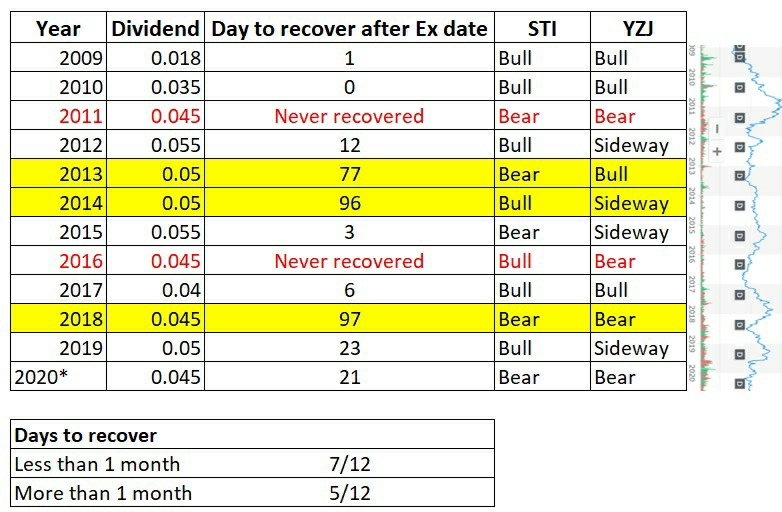 Base on historical data, the probability of YZJ to recover the dividend after Ex date is higher when both STI index and YZJ are experiencing bull run. However, we will not know this year is a bull or bear until the year end. What we can do is to anticipate it.