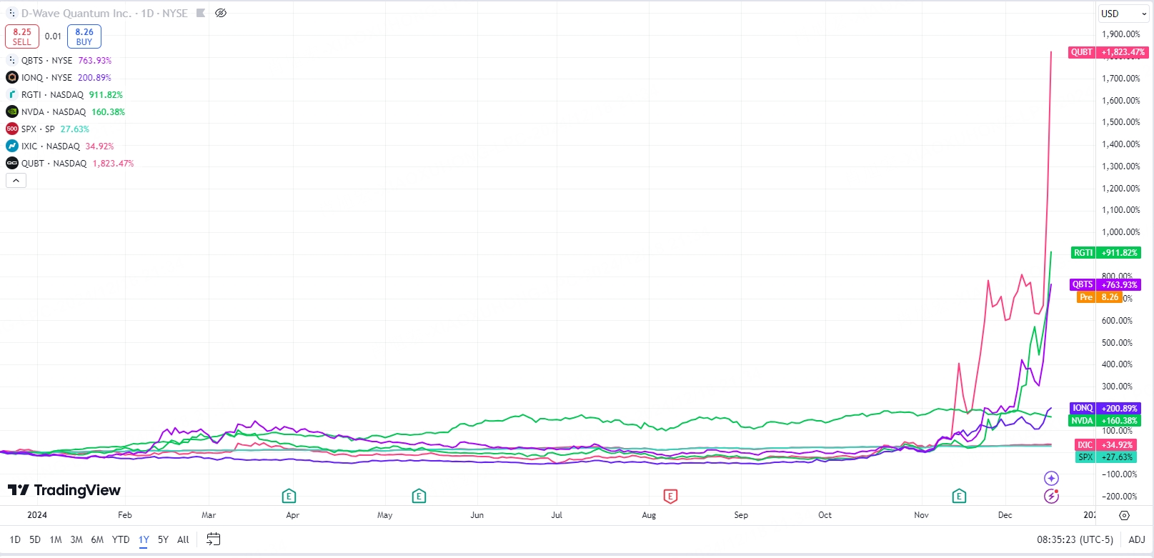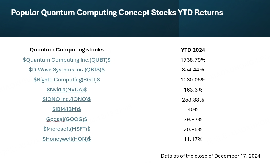 As of the close on December 17th, according to Trading View data, $Quantum Computing Inc.(QUBT)$ has risen by 1823.47% this year, $Rigetti Computing(RGTI)$ has surged by 911.82% this year, $D-Wave Systems Inc.(QBTS)$ has increased by 763.93%, and $IONQ Inc.(IONQ)$ has risen by +200.89%.