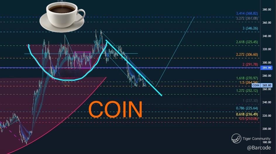 Support and Resistance Levels: The support level for Coinbase is around $180.00, and the resistance level is around $327.00.