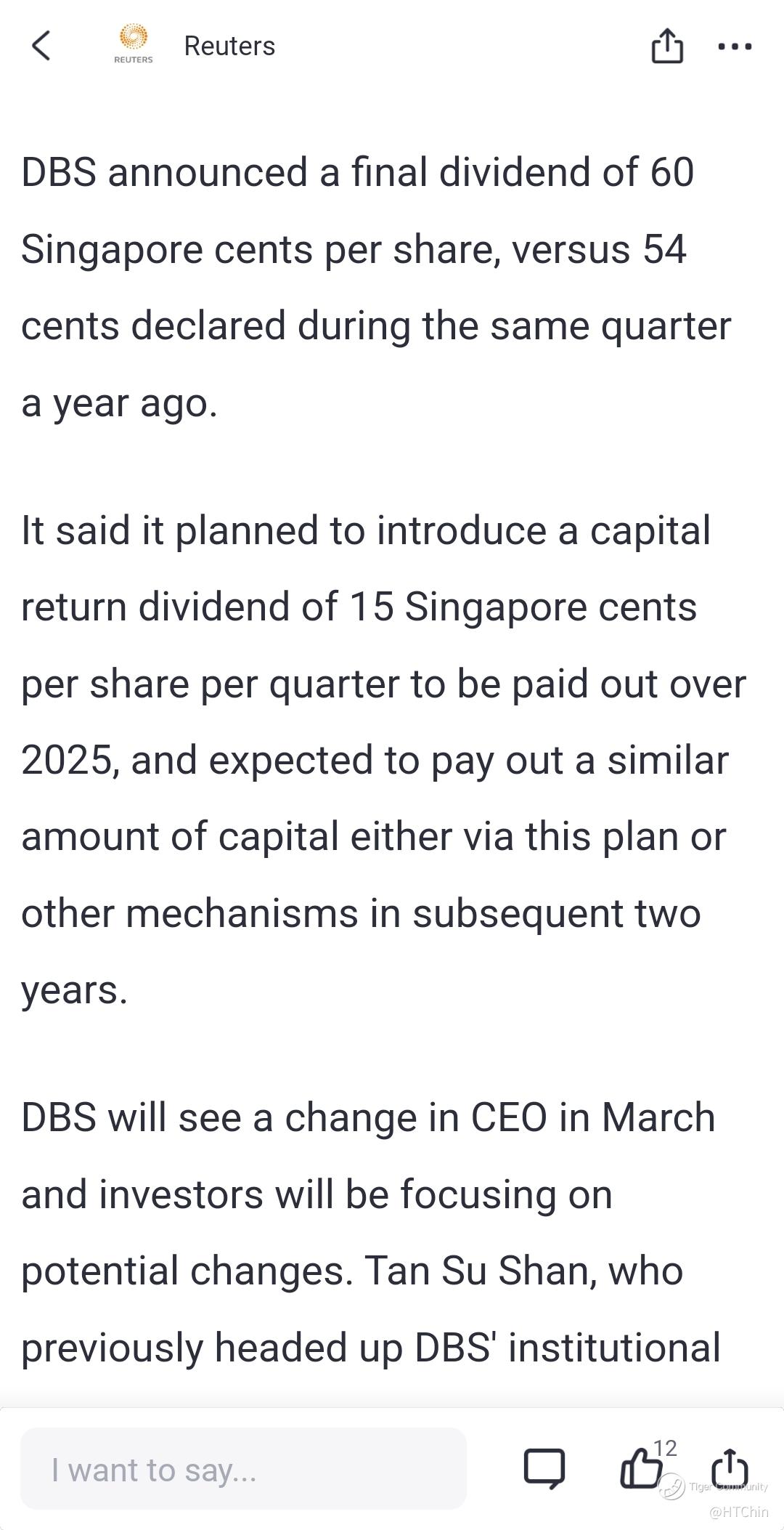 $DBS Group Holdings(D05.SI)$ Good capital reduction policy, $0.60(ordinary quarterly dividend) + $0.15 (capital reduction) = $0.75 quarterly payout in 2025.