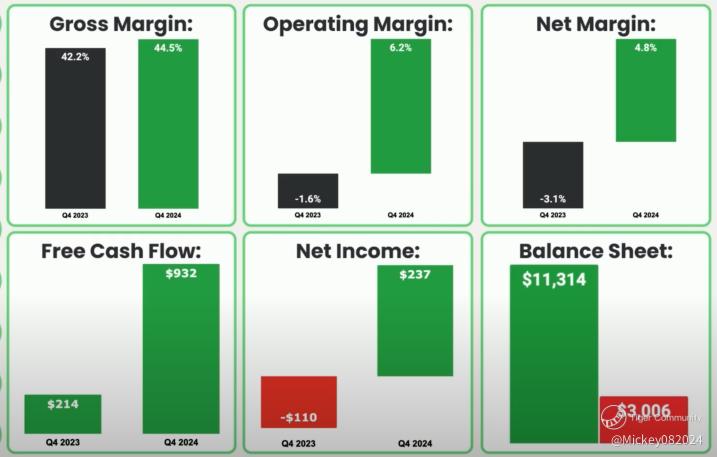 Earnings per share were 39 cents, which is a significant improvement from last year, though it did miss analysts' estimates. We’ll touch on that shortly. When it comes to margins, there’s a lot to like. Gross margins expanded by over 200 basis points year-over-year in Q4. Operating and net margins swung from losses to gains, which is a positive sign. Free cash flow surged more than fourfold, net income turned positive, and the balance sheet is in strong shape.