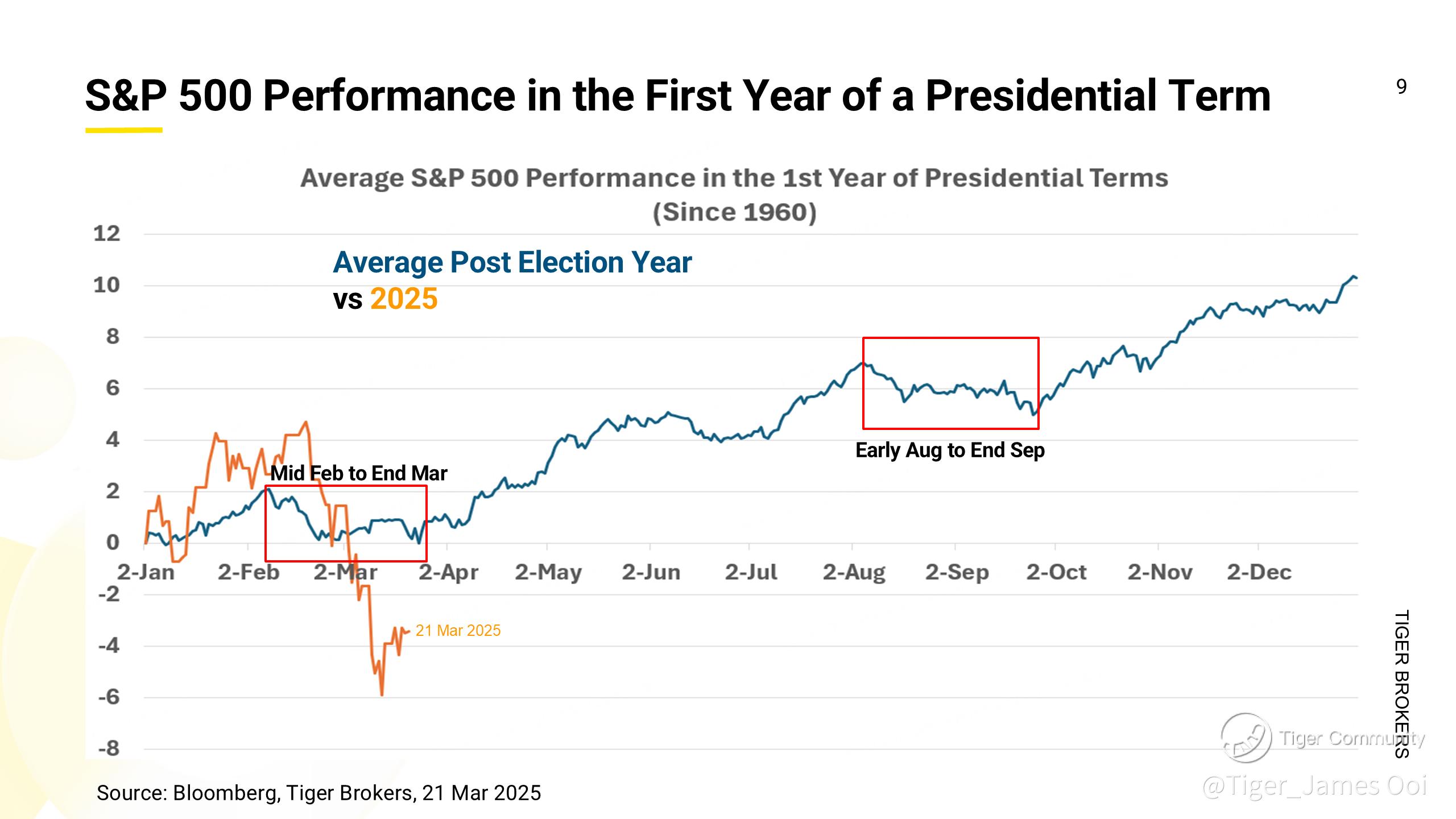 Historical data since 1960 shows that in the first year of a presidential term, the S&P 500 typically experiences two corrections: mid-February to late March and early August to late September.