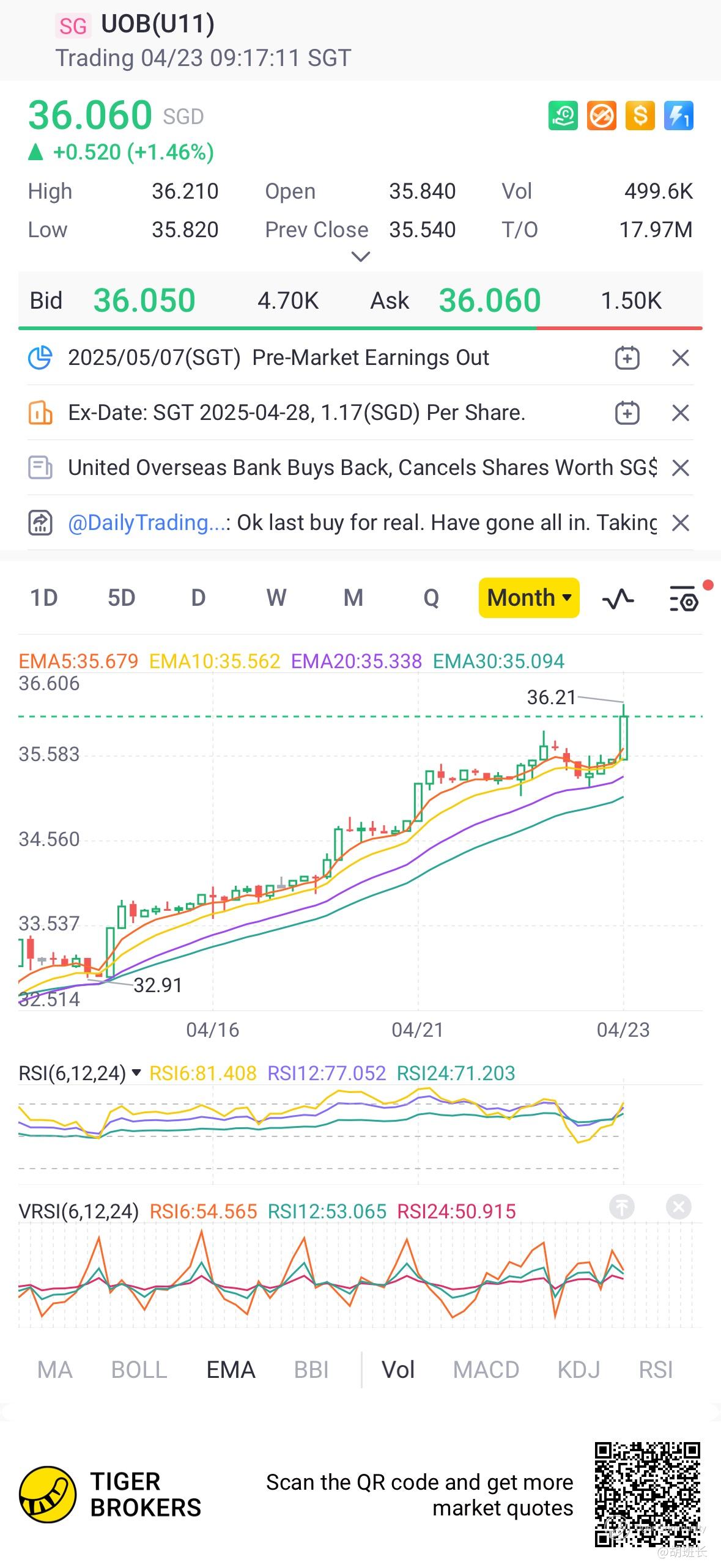 $UOB(U11.SI)$ 1-month high
