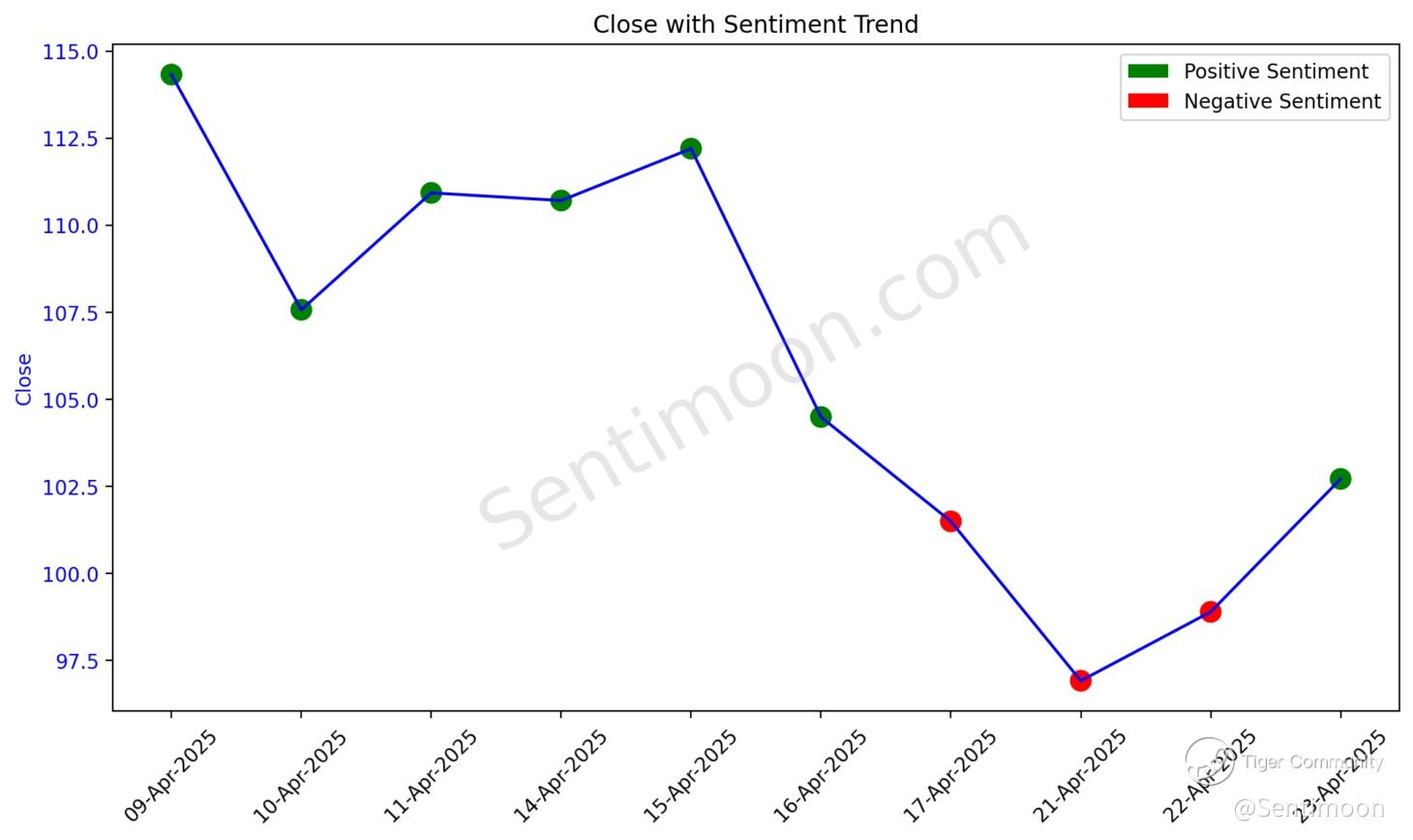 Over the past 10 sessions, the price exhibited volatility, starting at 114.33 before declining sharply to 96.91, with a partial recovery to 102.71 by the end of the period. The sentiment trend remained predominantly positive (↑) until 17-Apr, when it turned negative (↓) as prices fell, before rebounding (↑) on 23-Apr. Despite fluctuations, sentiment stayed resilient during most of the downtrend, only weakening briefly during the lowest closes.