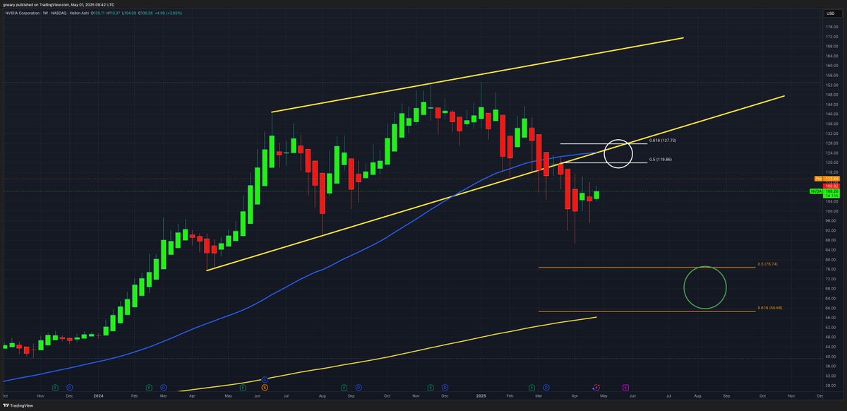 $NVIDIA(NVDA)$ one week later and in spite of a lot of noise in the market, the price action is still moving to the white circle. Where the 50 WMA is waiting, the 0.5 - 0.618 Fib range is and the rising wedge bottom line.....AND aligning with the earnings date on the 28th of May. Very important test of this area coming up. A rejection in the white circle and it is down to the green circle, below $76.
