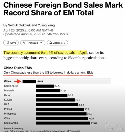 In April, China issued nearly half of all dollar- and euro-denominated bonds from emerging markets—a staggering share that reveals a growing shift in global capital flows. But what’s more important than the volume is the cost of borrowing. Despite rising geopolitical tensions, China is actually borrowing money at cheaper rates than the U.S. Treasury.
