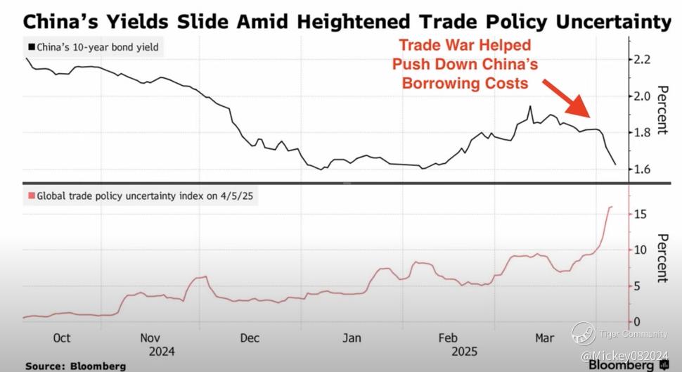 Ironically, the tariff war made Chinese bonds more attractive. Since the conflict began, global investors have been pouring into Chinese debt markets. As demand rose, yields on China's 10-year bonds fell below 1.7%, allowing Beijing to borrow more cheaply than Washington.
