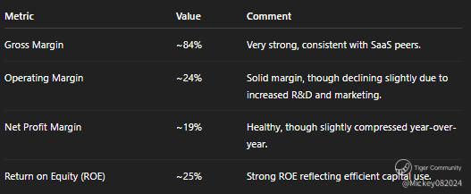 Metric Value Comment Gross Margin ~84% Very strong, consistent with SaaS peers. Operating Margin ~24% Solid margin, though declining slightly due to increased R&D and marketing. Net Profit Margin ~19% Healthy, though slightly compressed year-over-year. Return on Equity (ROE) ~25% Strong ROE reflecting efficient capital use.