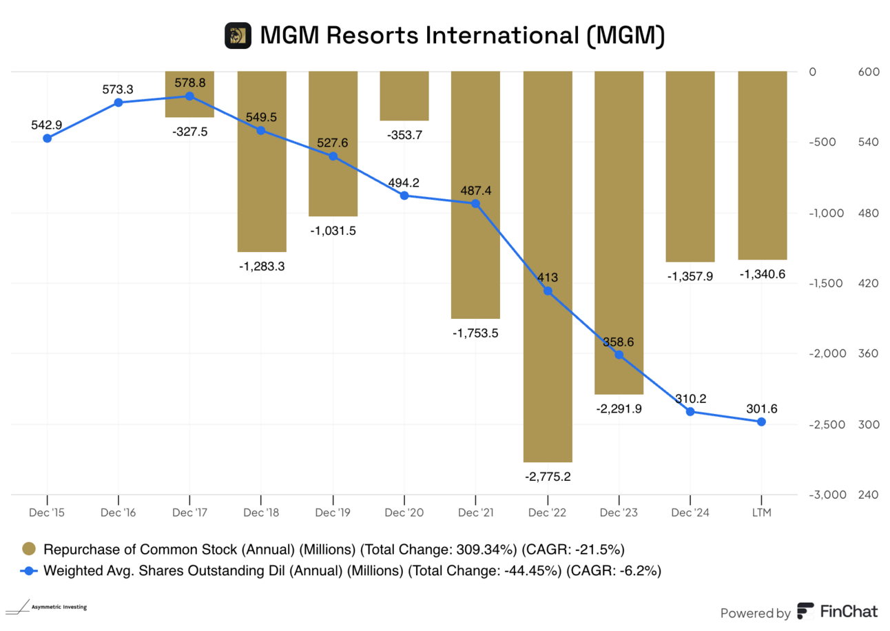 $MGM Resorts International(MGM)$ , on the other hand, is buying back stock at an extremely cheap price. Management has anticipated slowing down buybacks, but thinks the stock is so cheap that it may be worth taking on debt to buy the stock. A $2 billion buyback authorization announced last week would reduce shares outstanding by nearly 25%.