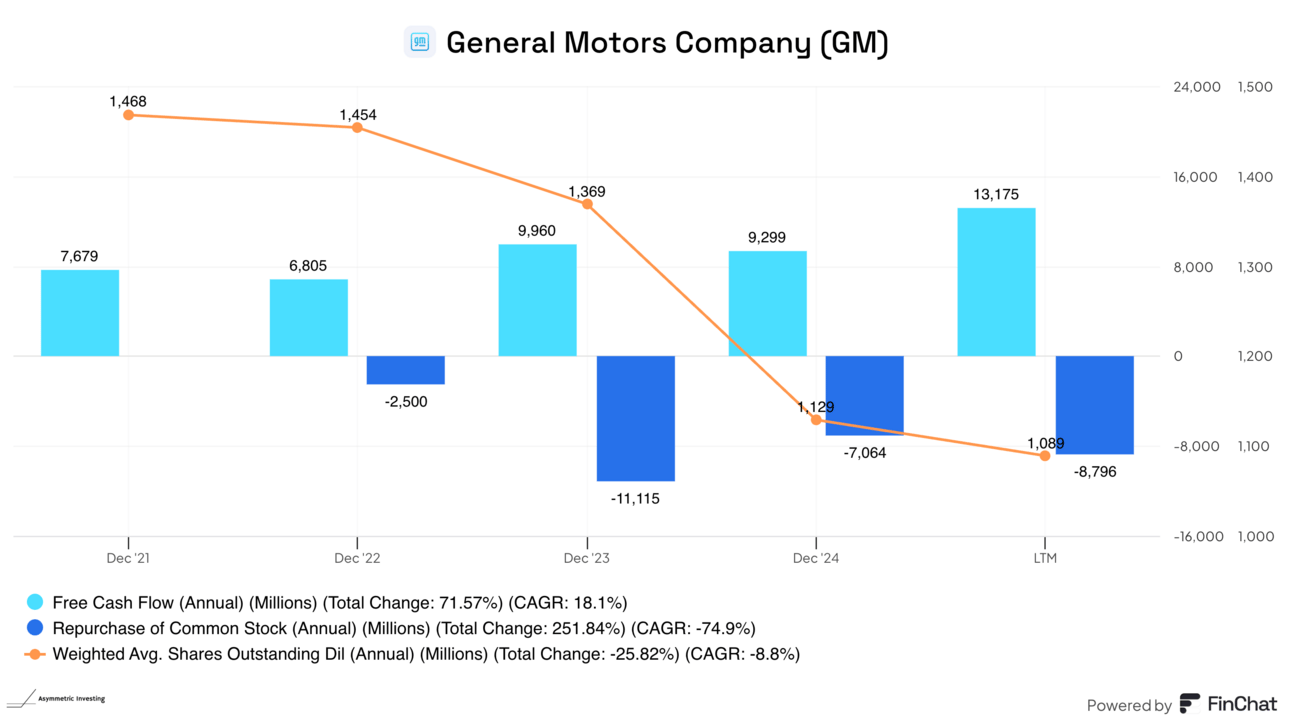 $General Motors(GM)$ is another good example of a great buyback. The stock trades for 4-5x earnings, and you can see the share count is down at an 8.8% CAGR since 2021, and this chart doesn’t even do it justice. Shares outstanding ended Q1 2025 at 983 million.