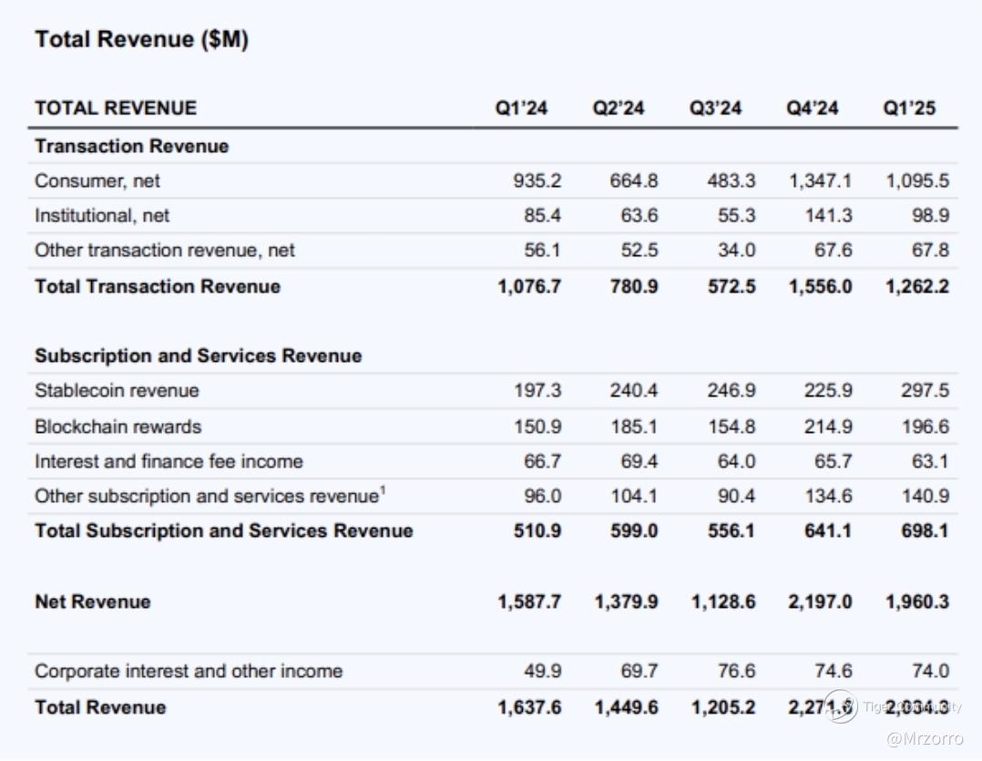 Transaction revenue fell 19% to $1.3 billion in the first quarter from the three months as volume declined as crypto prices declined, tracking losses across the broader market "driven by tariff policy and macroeconomic uncertainty," the company said.