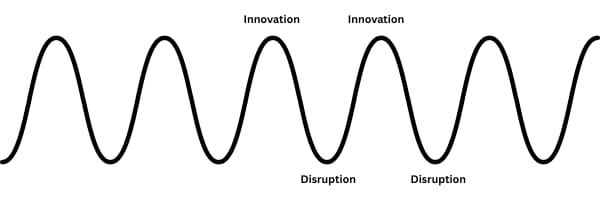 Tech companies seem to always be in a state of rapid growth or existential disruption. Companies succeed in one paradigm, miss the next paradigm, and then lead the third paradigm, like a sine wave of success and failure.