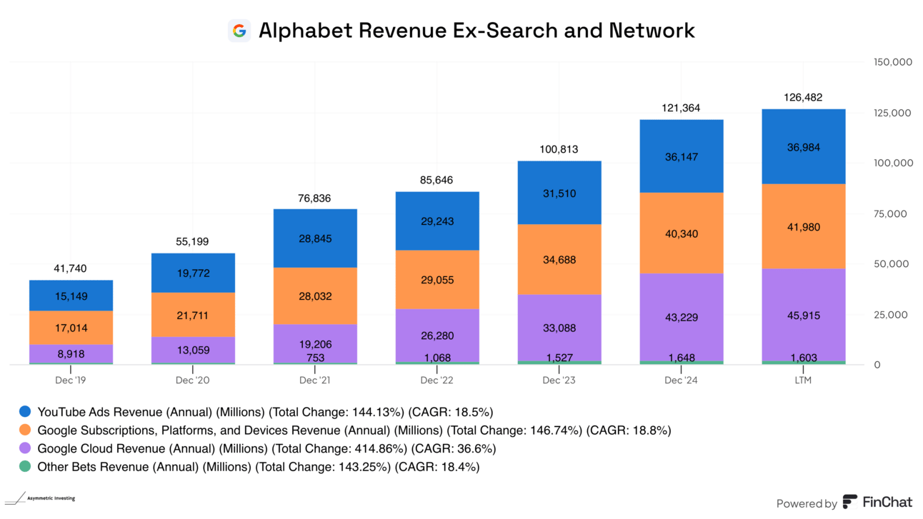 Alphabet has multiple businesses that won’t be disrupted by AI, like G-Suite, YouTube, Android, Maps, and Cloud. Even if search dies, the business that’s left is pretty amazing (see the image below).