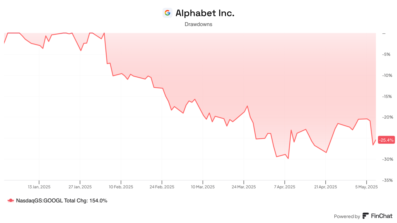 Shares of Alphabet have fallen 6.2% in the past five days and are now down 25.4% from their peak earlier this year.