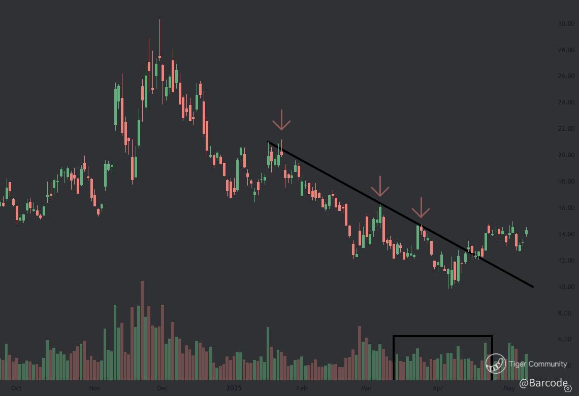 β’ Trading at $14.14 in pre-market with a confirmed breakout above the descending trendline.