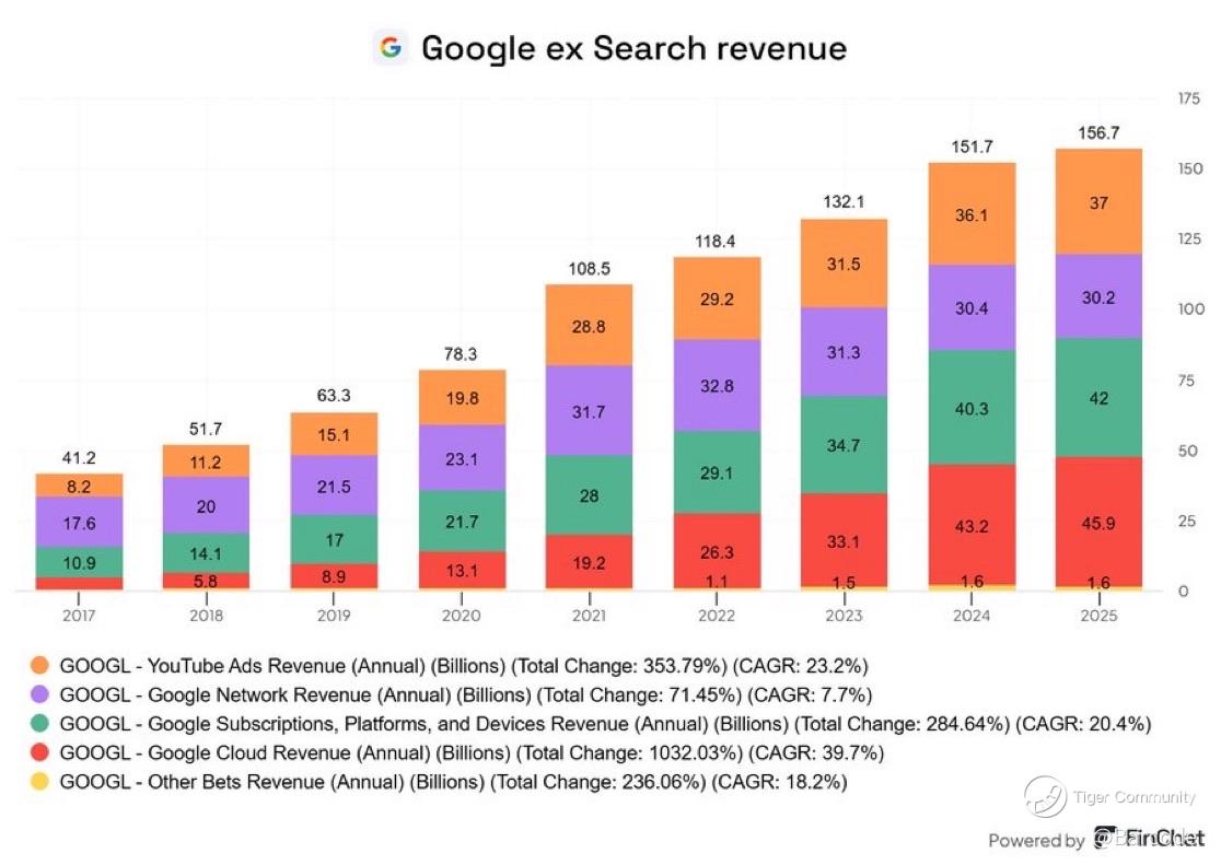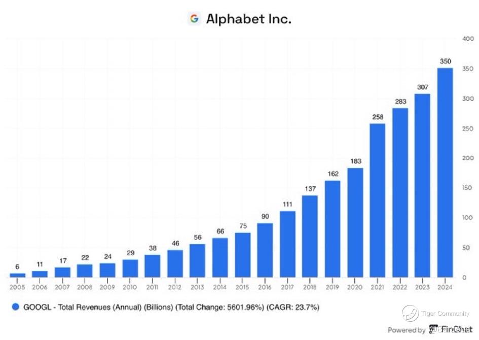 Alphabet’s grown from $6B in 2005 to $359.71B in 2025, a 5602% gain, with a 23.7% CAGR. The business doesn’t just scale. It compounds.