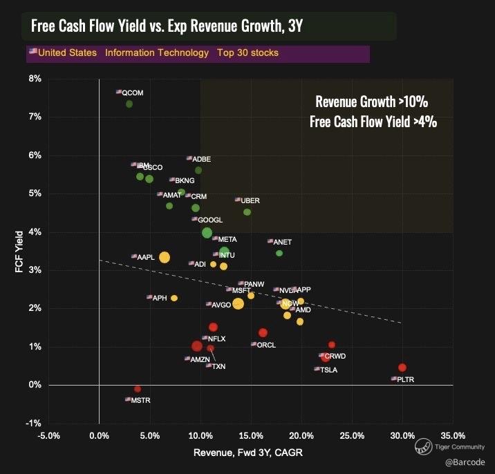 That elite quadrant is empty otherwise. Most high-growth tech, like $PLTR and $TSLA, offer 0% yield and sky-high valuations.