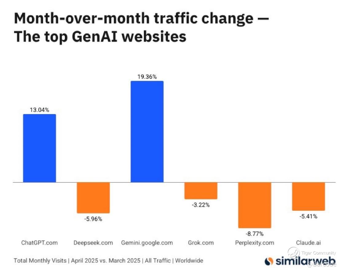 Gemini traffic surged +19.36% MoM in April, outpacing all major GenAI sites. While others decline, Googleβs ecosystem is expanding, not just with AI, but with ad spend, subscriptions, and Waymo on the horizon.