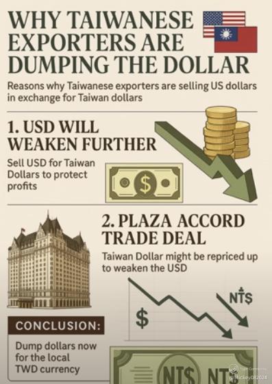 Speculation about a currency realignment. There’s talk that Taiwan had been managing its currency lower, but the strategy may be unraveling. If a new "Plaza Accord"-style agreement emerges — forcing the NT$ higher to benefit U.S. exporters — Taiwanese firms could face enormous pressure.
