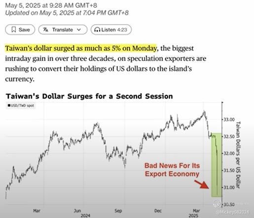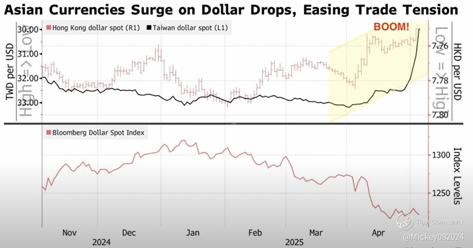 Since Trump took office, the dollar has fallen over 10%, with a sharp drop accelerating in April following reciprocal tariffs. The Hong Kong dollar has surged, and the Taiwanese dollar has soared — gaining 3% last Friday and another 5% on Monday.