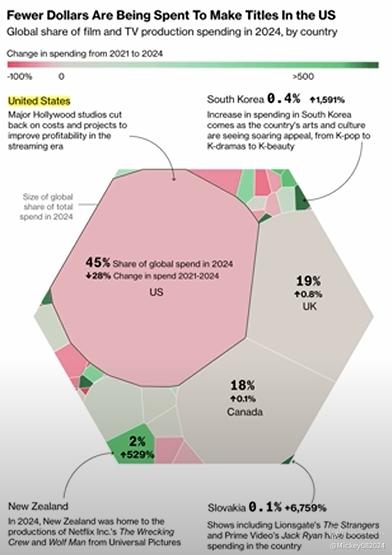 Does Trump have a point? U.S. market share in global film production has dropped. In 2024, the U.S. accounted for 45% of global film spend — about $15 billion — but that's down nearly 30% over recent years. Meanwhile, production spending has surged in places like South Korea, New Zealand, and Spain, thanks in part to Netflix and other global streamers.