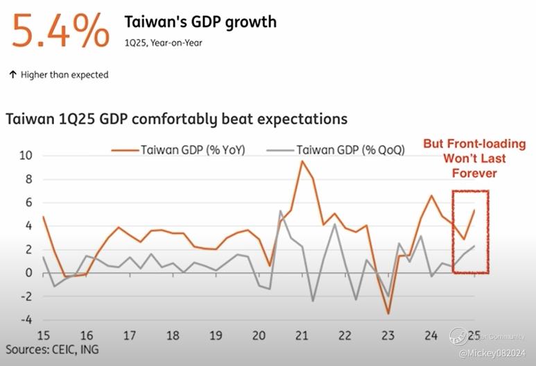 But the U.S.-China chip and AI war isn’t going anywhere. The U.S. will continue relying on Taiwan for advanced semiconductors. Even a new fab in Arizona won’t meet the demand. That’s why Taiwan's Q1 GDP shocked analysts, surging 5.4% — more than 100 basis points above estimates — driven by a rush of frontloaded U.S. imports.