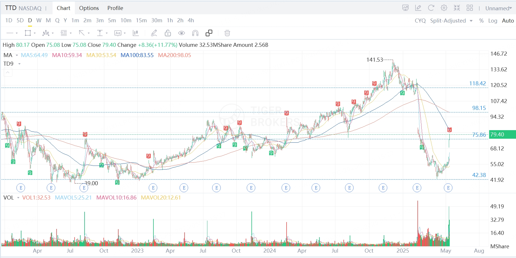 With a strong Q1 earnings release and broader market tailwinds, TTD rallied 18.6% and 11.77% over two consecutive trading days, gaining 43% in just a week.
