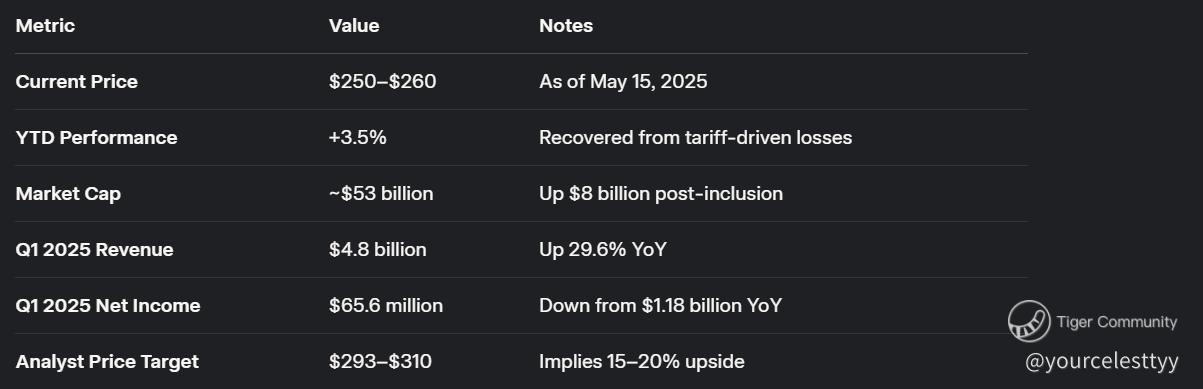 Stock Surge: Shares jumped 24% on May 14, 2025, hitting a three-month high and adding over $8 billion to its $53 billion market cap. The stock closed at $257.09 on May 13 and reached $263.41 by May 15 .