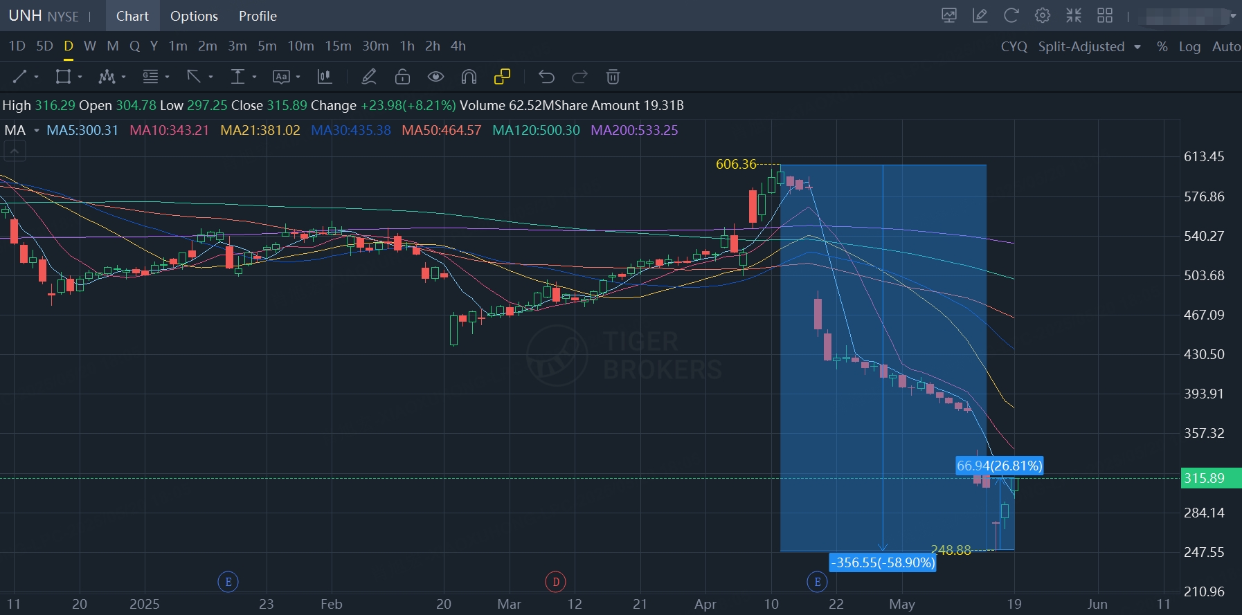In April, UNH experienced a significant drop due to its earnings guidance falling short of expectations. The situation was further exacerbated by the change in CEO in May, leading to another sharp decline. At its worst, UNH's decline from its April peak exceeded 58%.