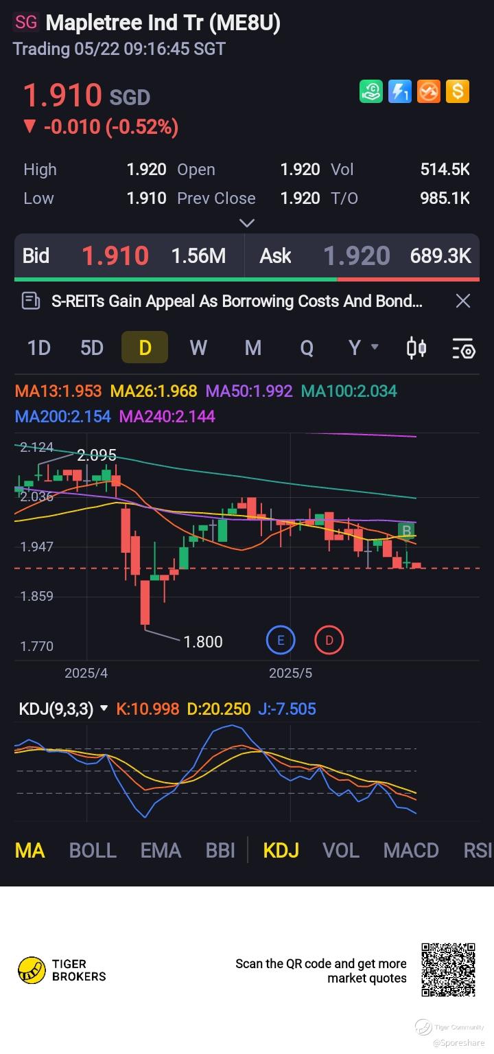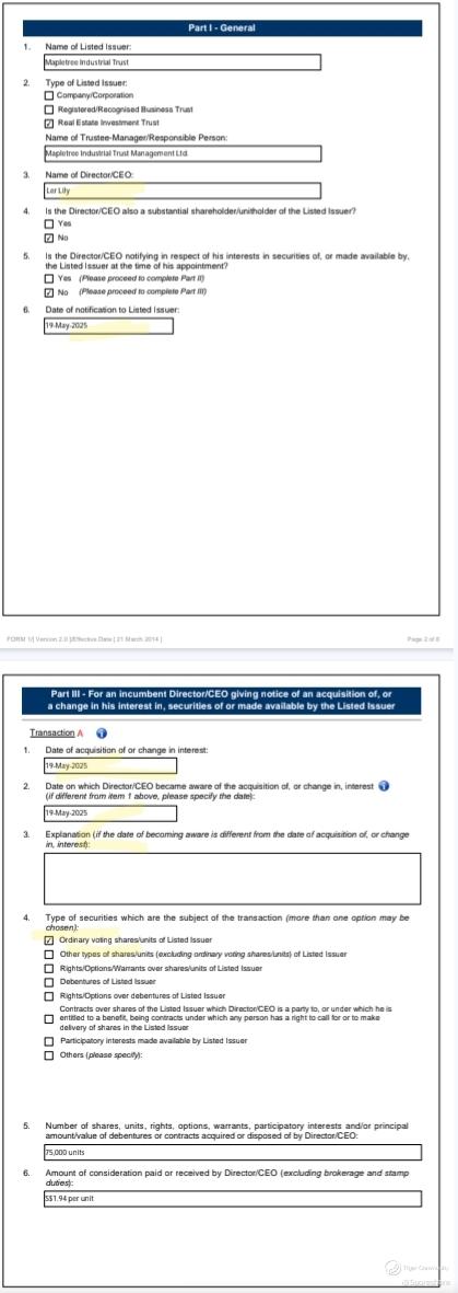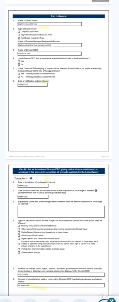Mapletree Ind Tr - CEO bought 75k share on 19 May at 1.94 per share , it might be a boostvof confidence or the price is undervalued!