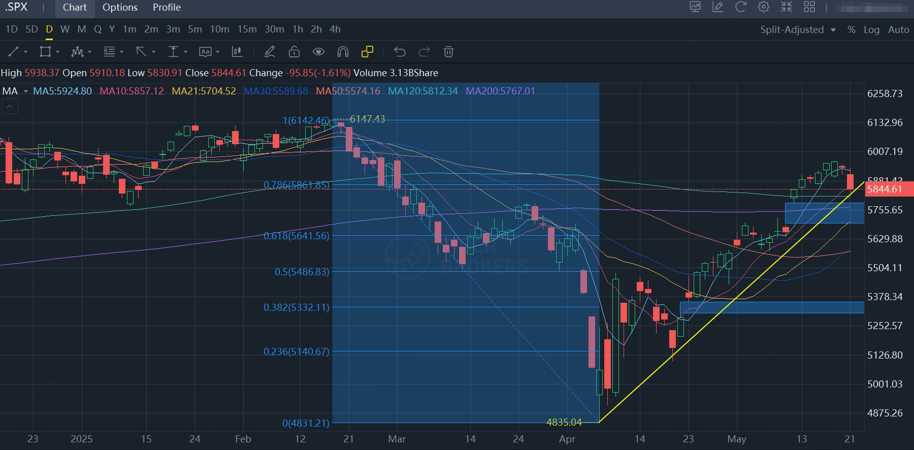 The $S&P 500(.SPX)$ fell 1.61% on Wednesday, closing at 5844.61 points; after breaking the 200-day moving average at 5812.34, the 120-day moving average at 5767.01 also encountered challenges, and the first gap below also needs to be filled healthily. If the 50-day moving average is broken, it is very likely that the gap below 5378 points will also need to be filled.