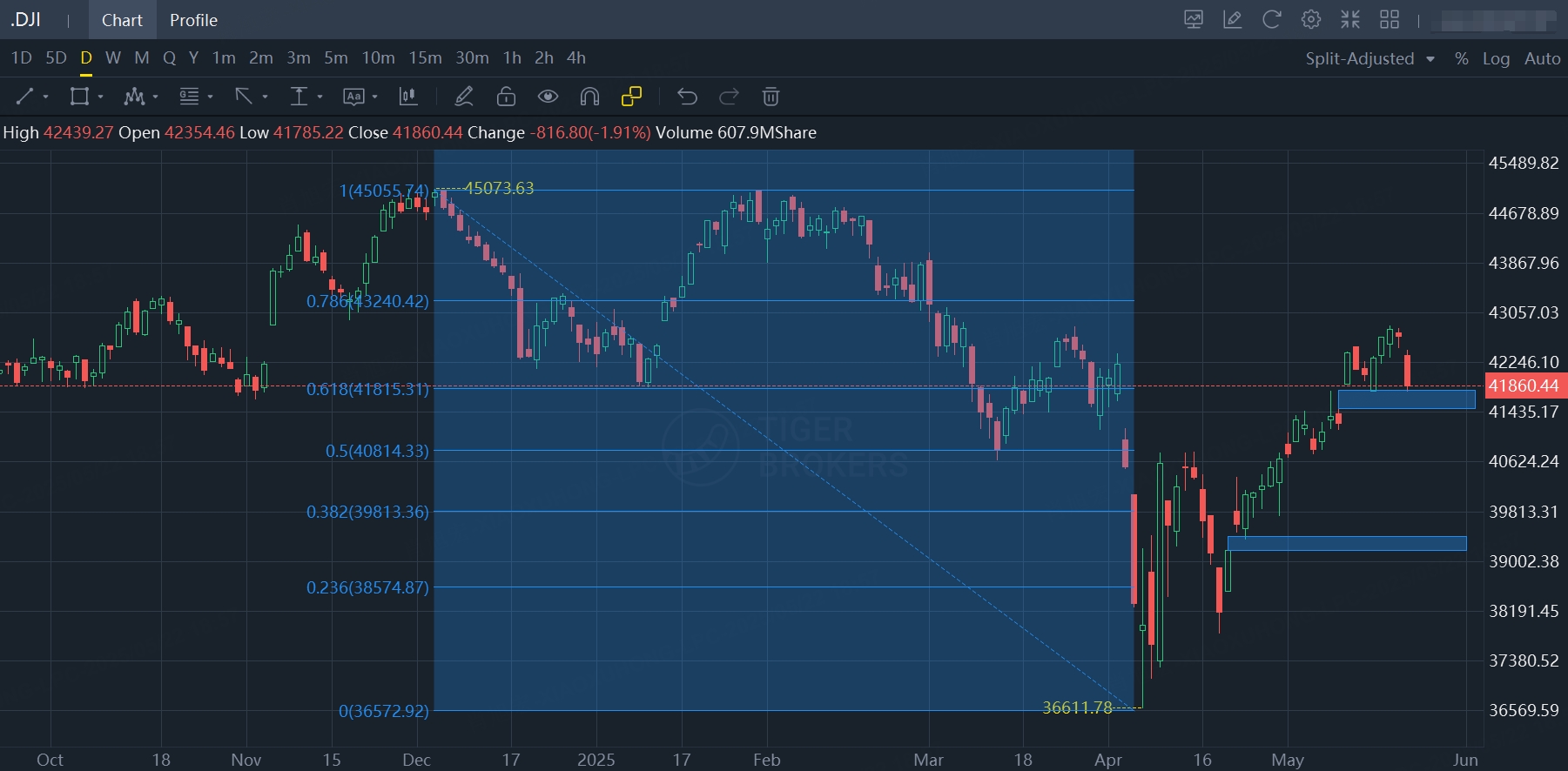 $Dow Jones(.DJI)$may lose the 0.618 interval point of the Fibonacci sequence, and there needs to be support at the 0.5 position. Otherwise, there will be a more declines.