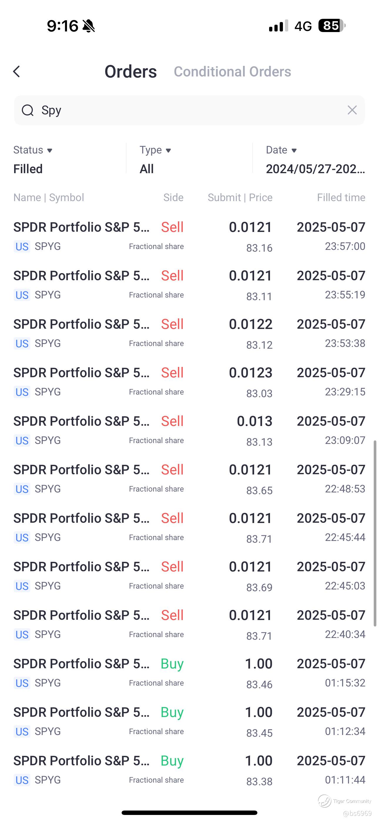 During times of volatility, most investors either panic or freeze — but not me. Thanks to my disciplined dollar-cost averaging (DCA) approach, I keep investing at regular intervals regardless of market sentiment. Just look at my recent trades in SPYG (SPDR Portfolio S&P 500 Growth ETF). Across May 7, 2025, I made several micro sales and purchases. While the market swung between $83.03 and $83.71, I wasn’t trying to time the top or bottom. I just stayed the course.