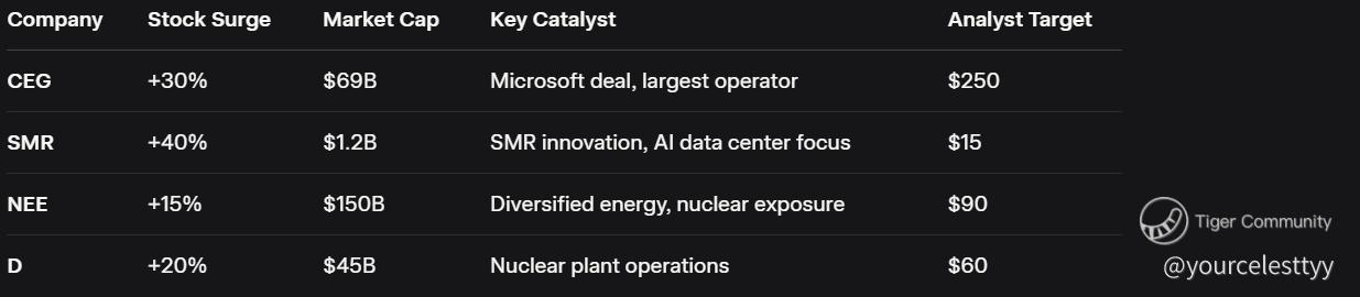 Constellation Energy (CEG): As the largest U.S. nuclear operator, CEG’s deal with Microsoft and existing infrastructure make it a top pick. Analysts target $250, a 20% upside from $208 [Yahoo Finance]([invalid url, do not cite]).