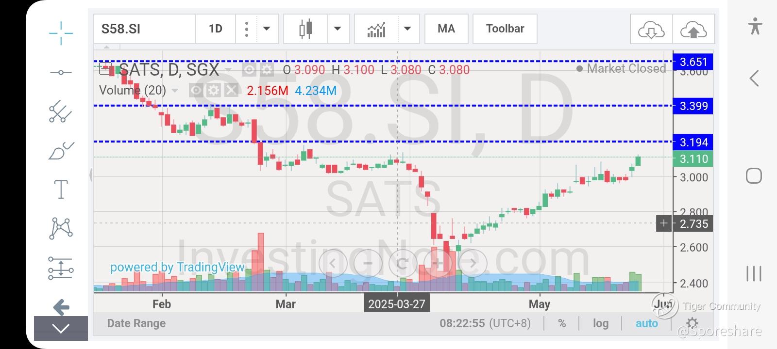 Sats - Yesterday she had a nice breakout at 3.07 and closed well at 3.11, up 6 cents coupled with high volume this is rather bullish. I think likely to continue this uptrend mode.