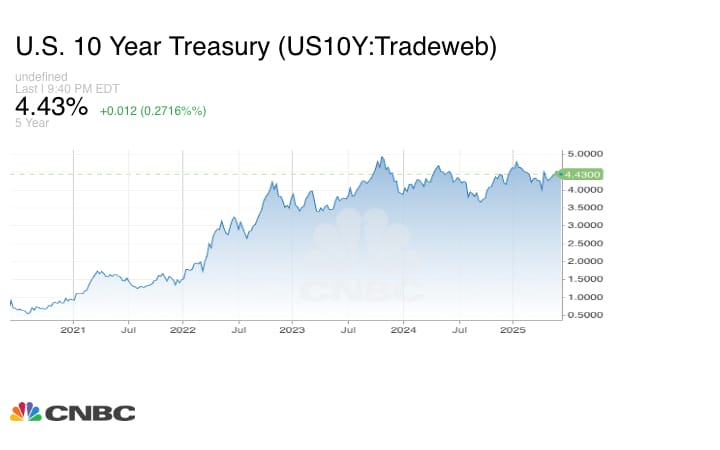 10-year yields have been flat-ish for over a year, but the context with which they have risen over the past year is concerning. Inflation was under control and the economy was slowing, which would usually lead to rate cuts, but tariffs threw a wrench in that, and now even long-dated yields are rising because the market thinks U.S. debt is riskier than it once was.