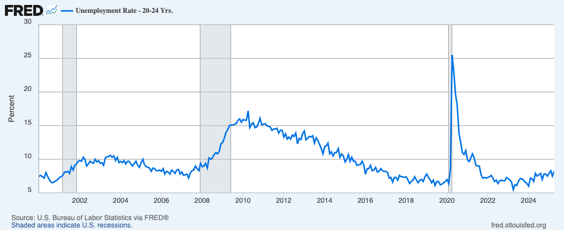 What do we see in the data? This chart was a little jarring when I first saw it. And 9.6% of men 20-24 are unemployed, up from 6.7% a year ago.