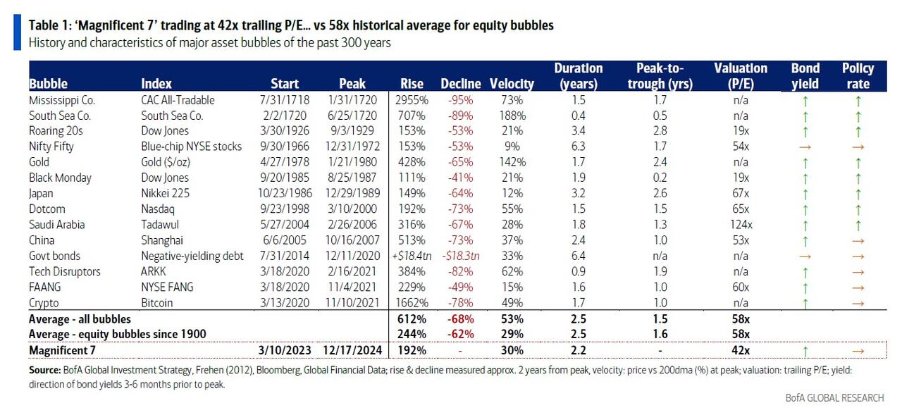 Bank of America (BofA) analyzed past asset bubbles and found that, on average, stock market bubbles saw 244% gains from takeoff to peak, with an average price-to-earnings (P/E) ratio of 58x.