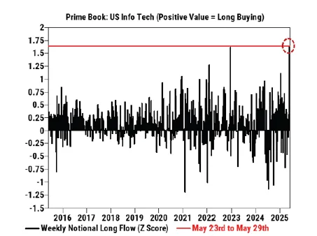 In the Information Technology sector, hedge funds logged a third straight week of net buying. In fact, last week's nominal long buying in tech was the highest in over a decade.