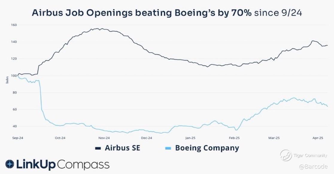 Airbus recently posted Q1 deliveries of 136 commercial aircraft, edging past Boeing’s 130. Behind this outperformance lies a structural workforce trend. Airbus job openings are up 35% since September, while Boeing’s have plummeted by 35%. The LinkUp data (see chart) shows this isn’t noise, it’s a full-blown capacity pivot.