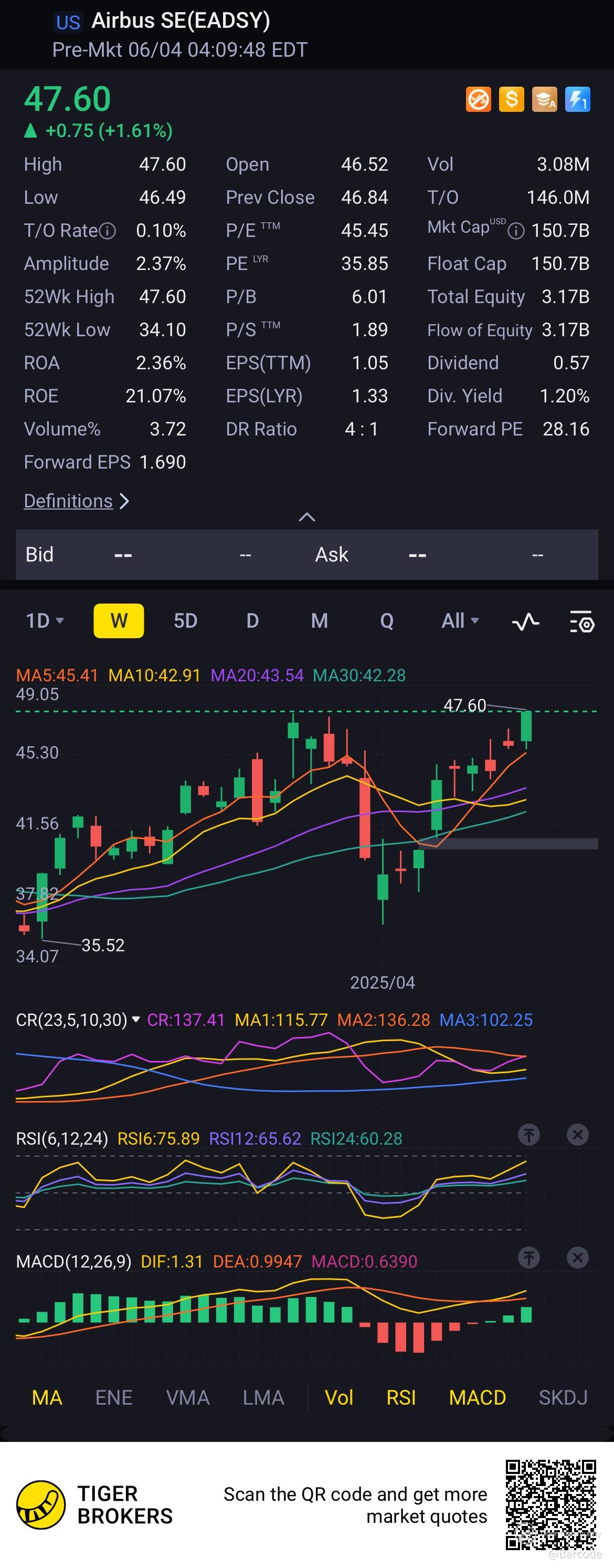 Airbus is pushing new 52-week highs, closing at $47.60, with: