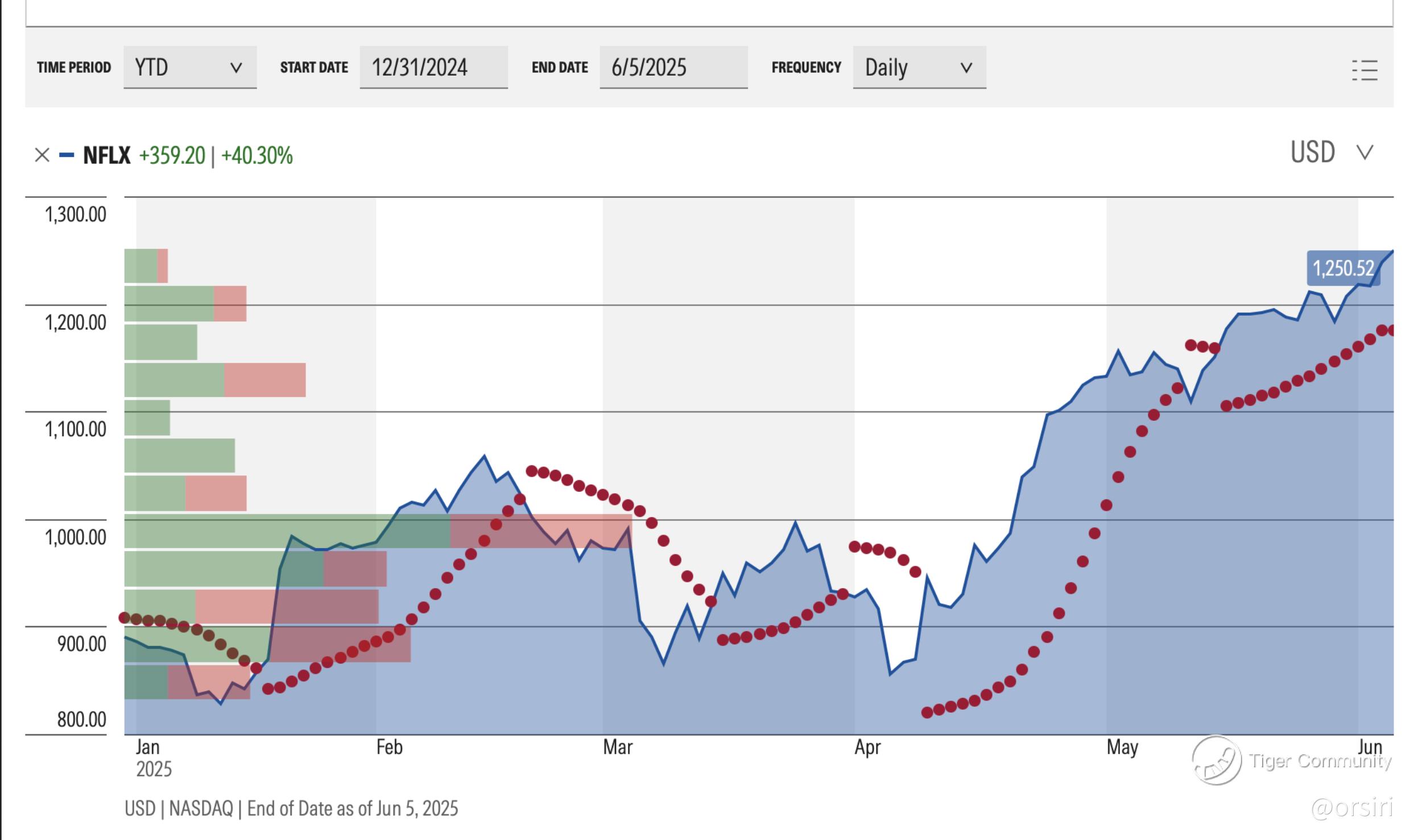 Netflix’s breakout in 2025 hasn’t just been about price — it’s where and how that price moved. Technicals confirm the breakout isn’t just sentiment-driven. The chart below shows how volume and price structure have shifted dramatically since January.