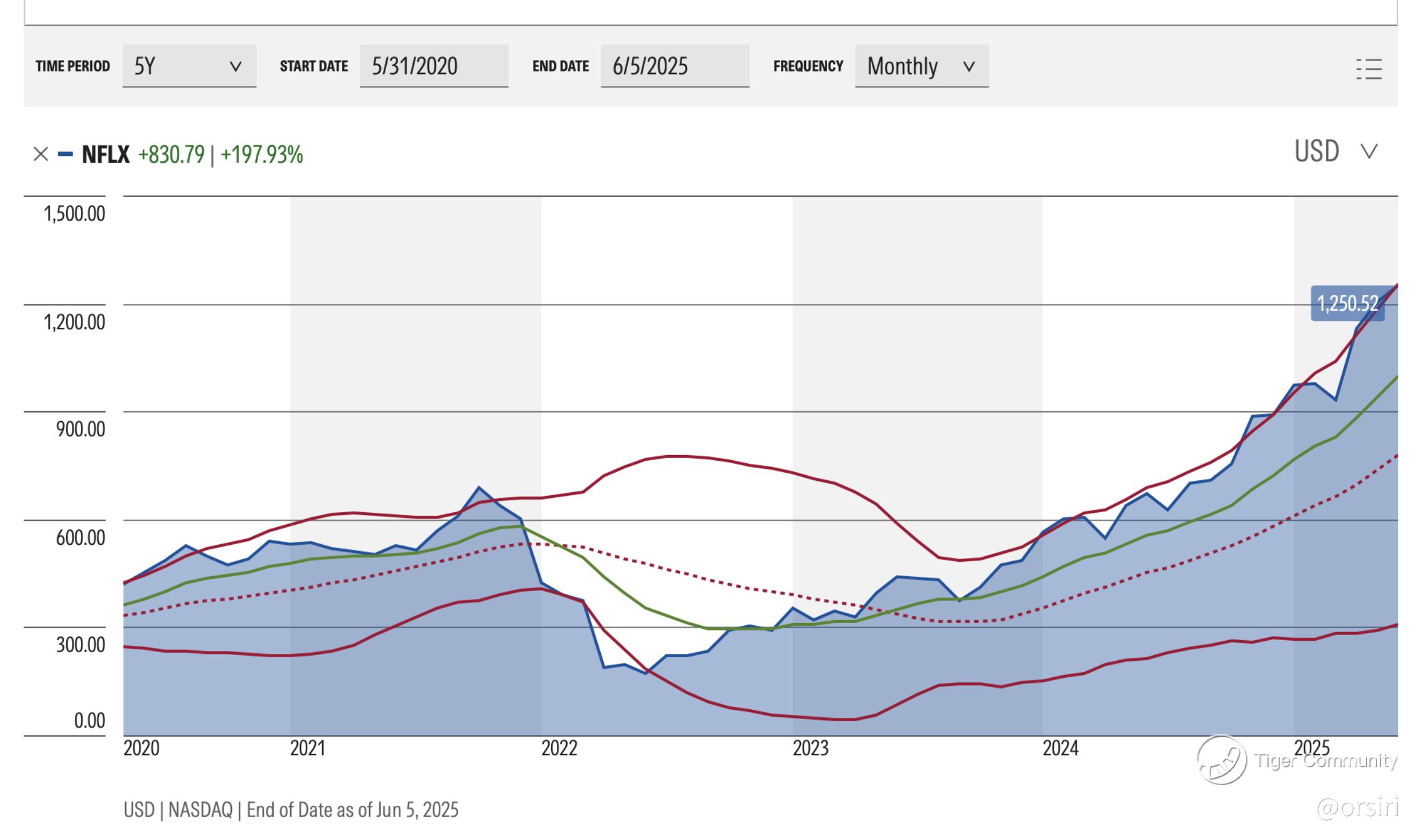 Pull back the lens, and a different Netflix emerges — one that’s trading with maturity. The five-year technical picture confirms a strategic rerating, with clean trend structure and reduced volatility pointing to a more stable, premium narrative.
