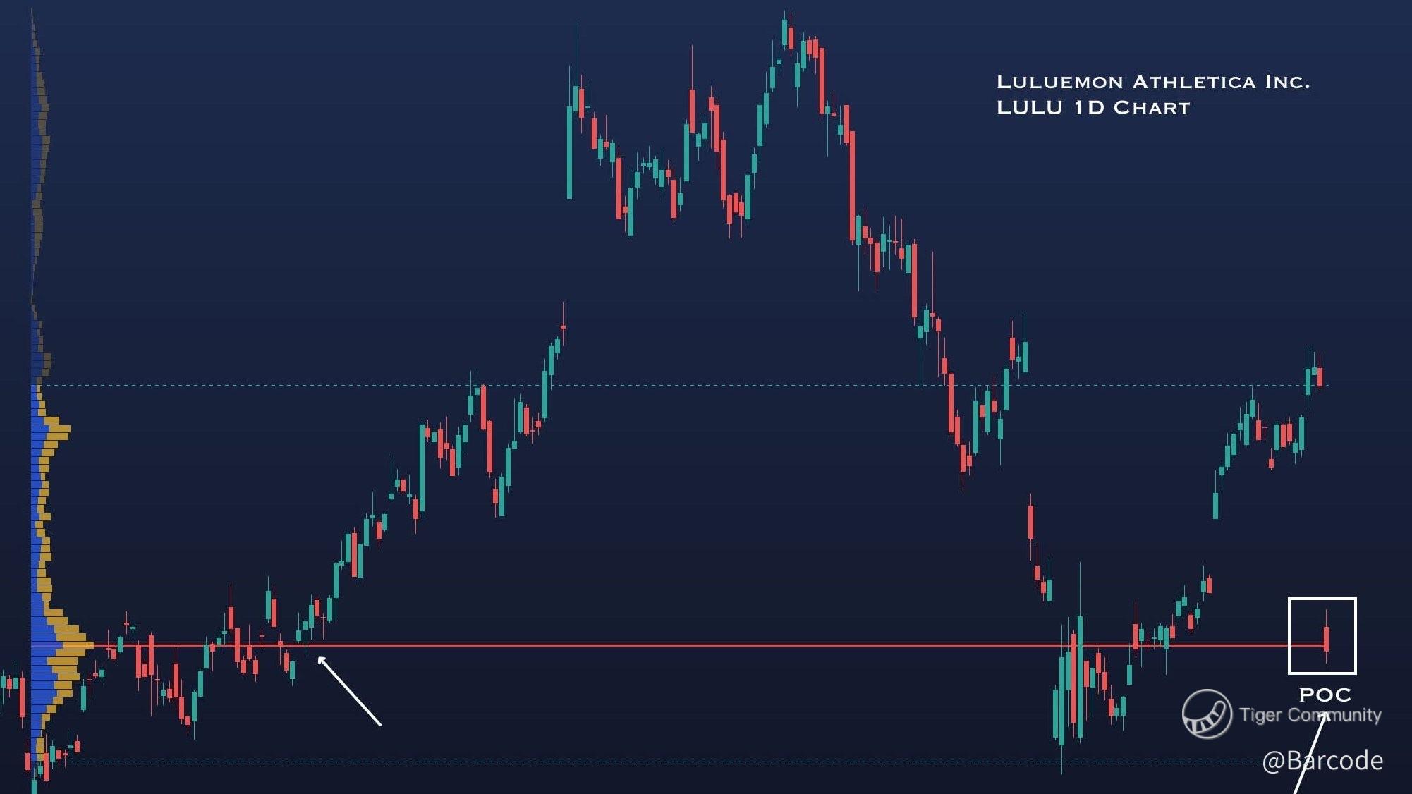 The selloff took $LULU down to a key Point of Control (POC) level shown in the volume profile chart, the same zone where bulls stepped in during March.